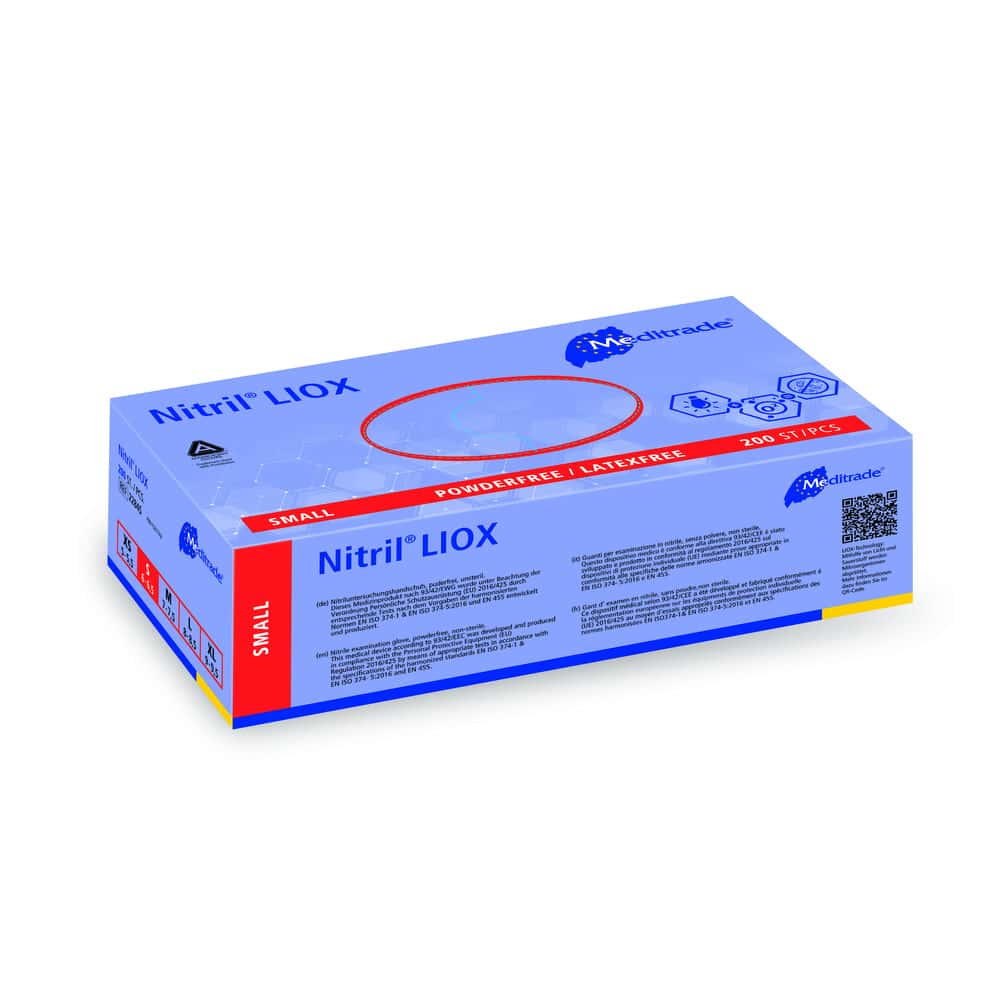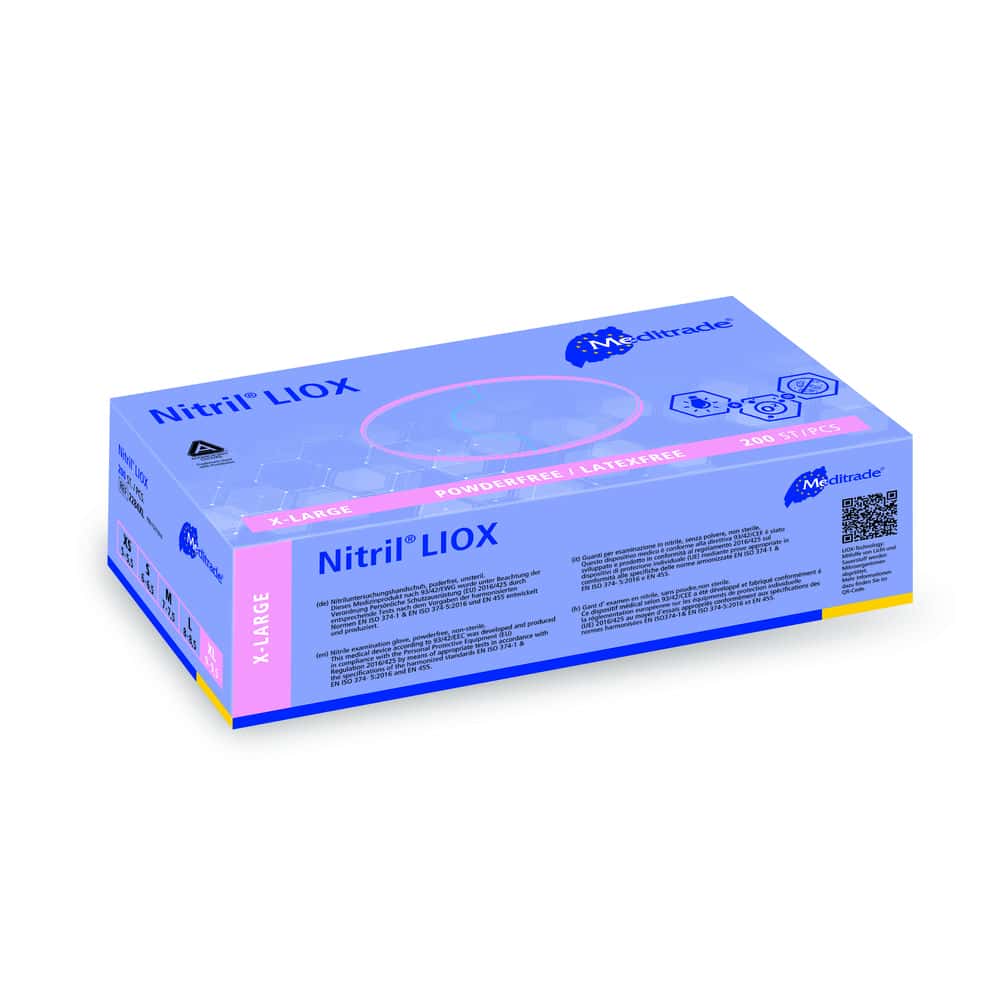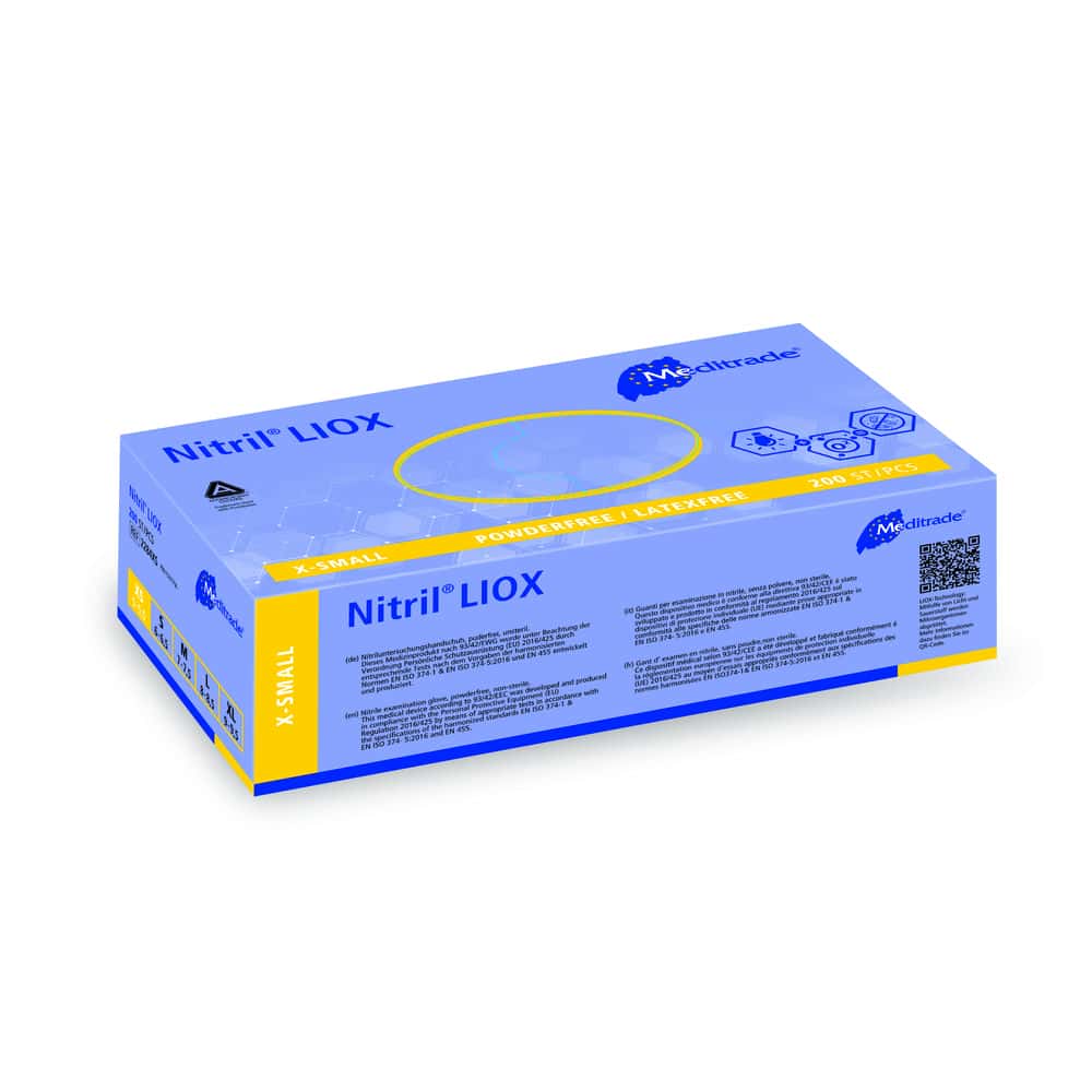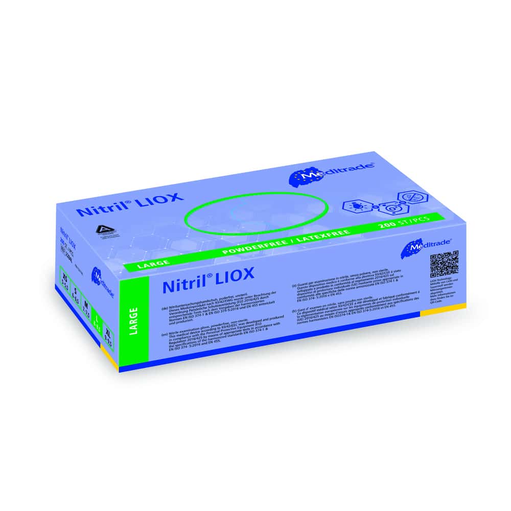 Der Meditrade Nitril LIOX® ist ein NItril-Untersuchungshandschuh aus Nitrilbutadienkautschuk. Im Gegensatz zu einem herkömmlichen medizinischen Untersuchungshandschuh, der nur eine passive Barriere zwischen Mikroorganismen und den Händen darstellt, spielt der antimikrobielle Handschuh Nitril LIOX® auch eine aktive Rolle um die Verbreitung von Krankenhaus-Infektionen zu verringern.